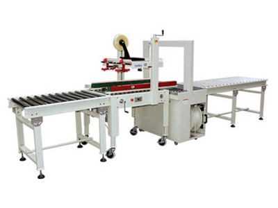 封箱機(紙箱膠帶封口)+高解析噴碼機(日期、批號、廠名等信息噴印打碼設備)+自動打包機(自動打出兩道PP帶。進行紙箱捆扎包裝)