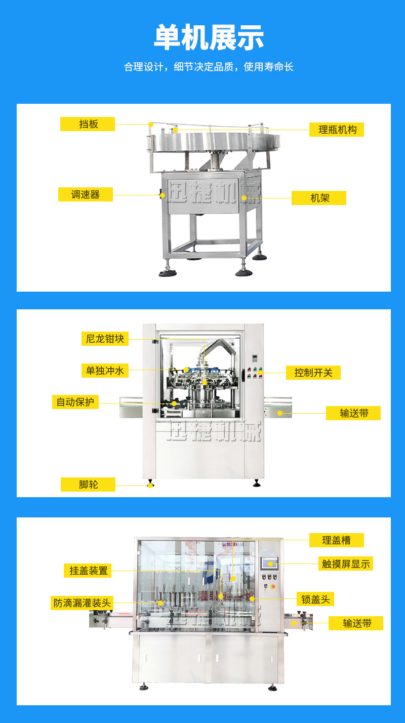公司主要經營兩大類產品:灌裝機和包裝機。其中灌裝機主要產品有:食用油灌裝機、液體灌裝機、膏體灌裝機、自動灌裝機、全自動灌裝機、辣椒醬灌裝機等;包裝機產品有:粉劑包裝機、顆粒包裝機、液體包裝機、自動包裝機、真空包裝機等。